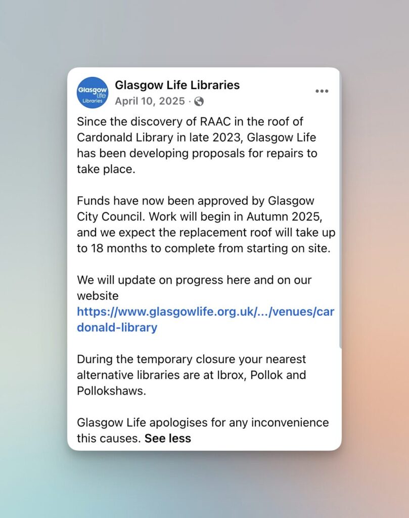 It has now been over two years since Cardonald Library closed due to concerns around RAAC (Reinforced Autoclaved Aerated Concrete). While the original closure was necessary on safety grounds, the prolonged lack of visible progress since then has become a growing concern for the local community.